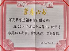海安县华达铝型材有限公司是专业生产铝材阳极氧化、超长阳极氧化、铝合金阳极氧化、大结构件阳极氧化等多种铝合金型材及制品的企业。以质量求生存,以创新求发展是企业宗旨。